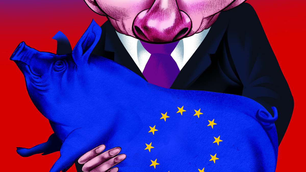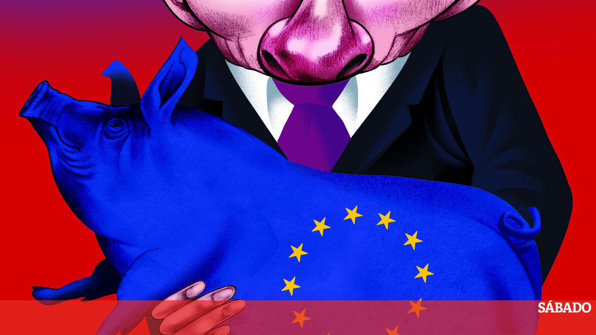 Vladimir Putin segura um porquinho mealheiro com as cores da União Europeia