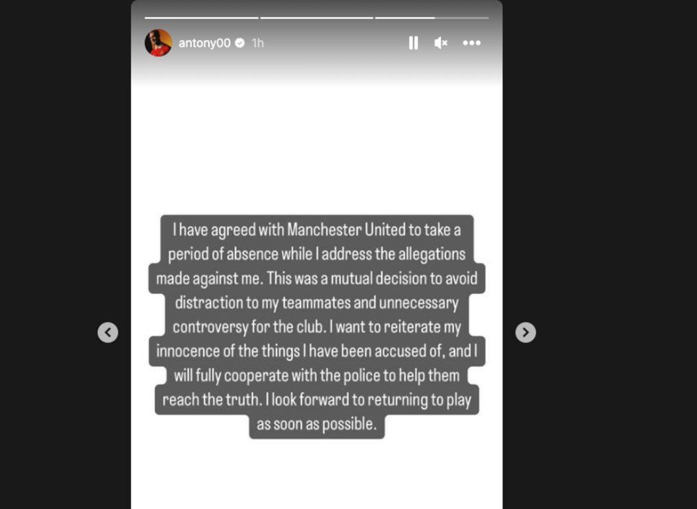 "Os jogadores que não participaram em jogos das respetivas seleções voltam aos treinos na segunda-feira. No entanto, foi acordado com Antony que ele adiará o seu regresso, até data a definir, a fim de responder às acusações".