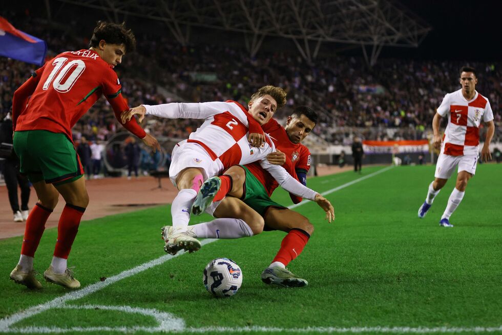 A formação das 'quinas' ia criando lances de relativo perigo para a baliza de Livakovic, em especial pela esquerda, flanco em que juntava João Cancelo, Nuno Mendes e Rafael Leão, com João Félix a aparecer no meio para tabelar com os colegas.