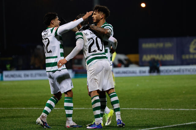 Jogadores do Sporting celebram um golo no relvado