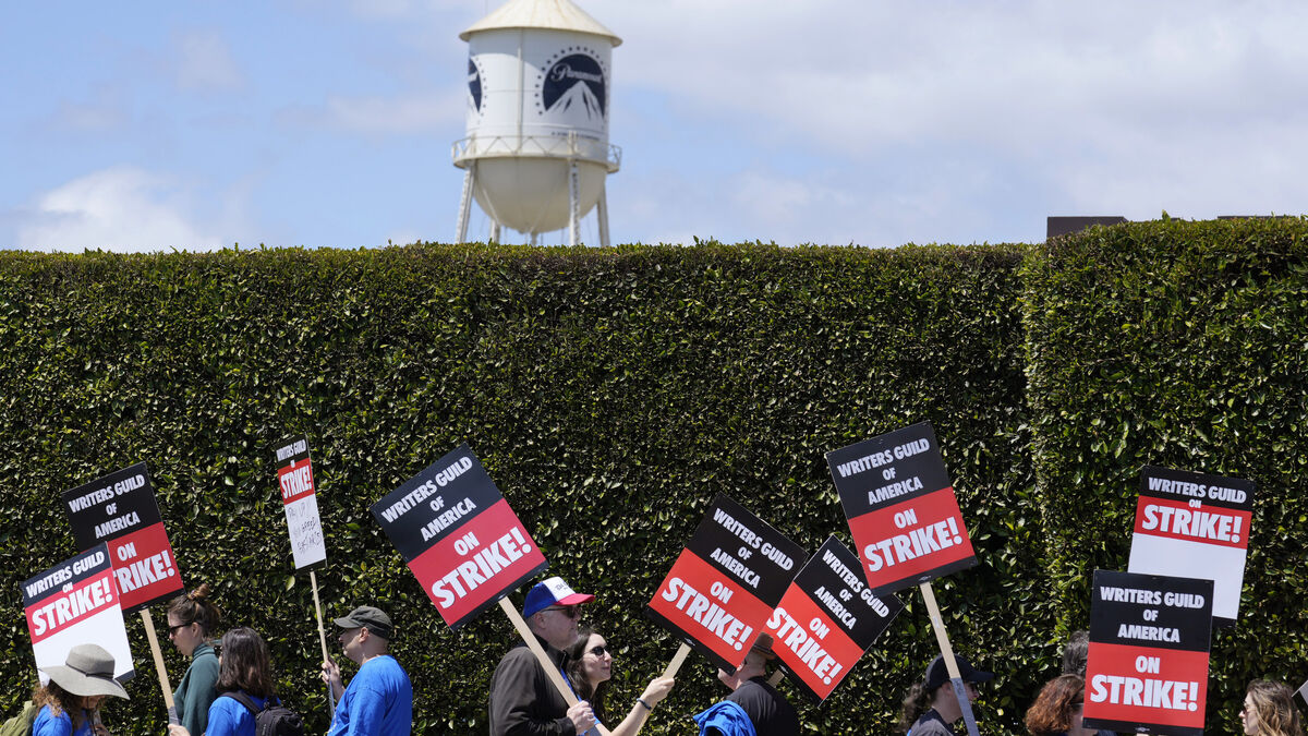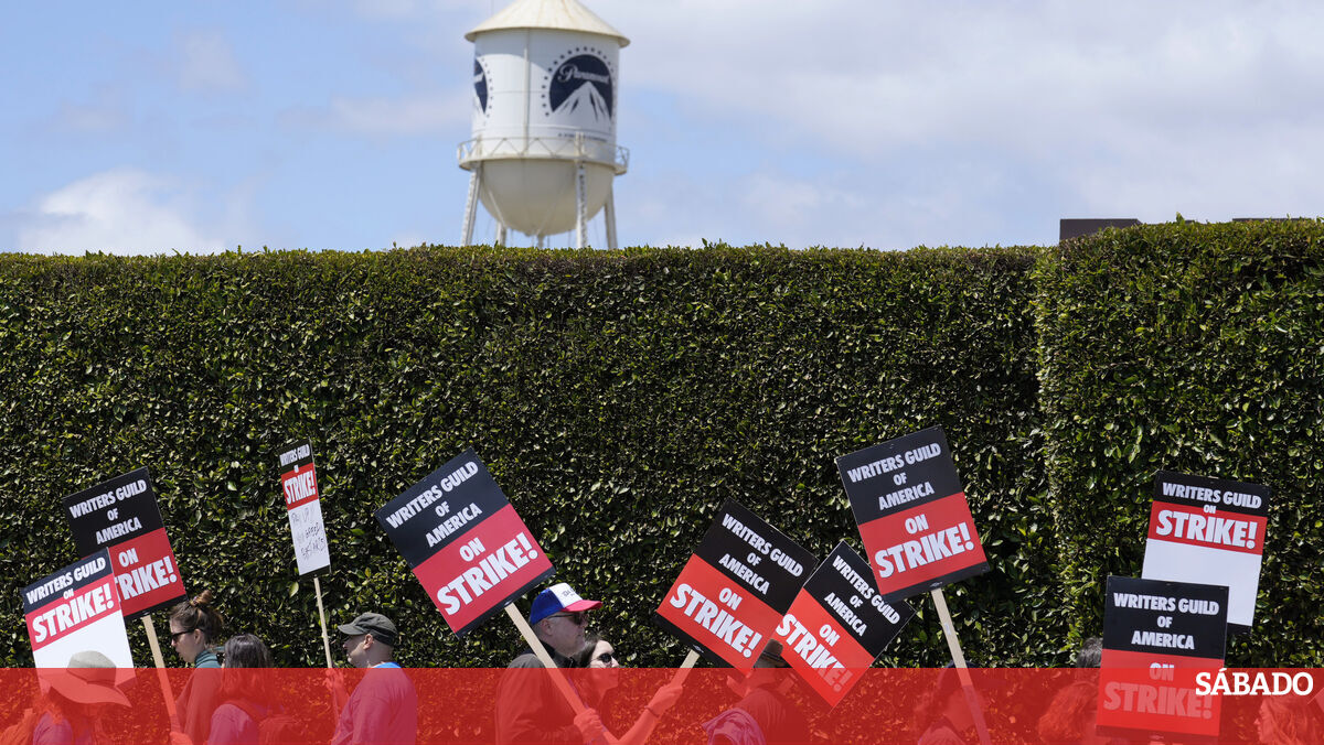 Protesto dos argumentistas da Writers Guild of America em Los Angeles contra despedimentos na Paramount PicturesAP Photo/Chris Pizzello