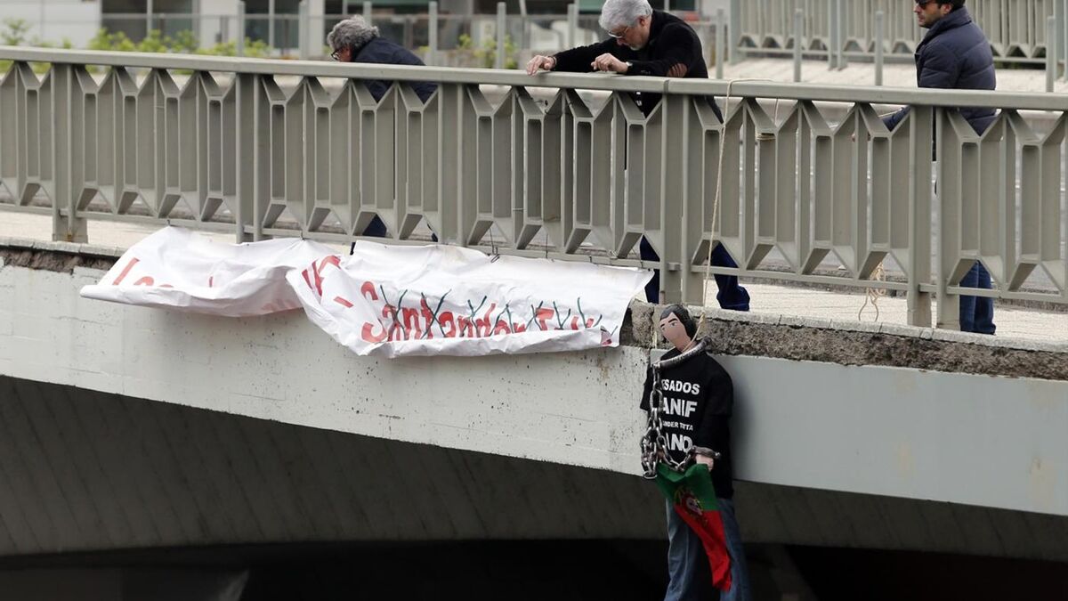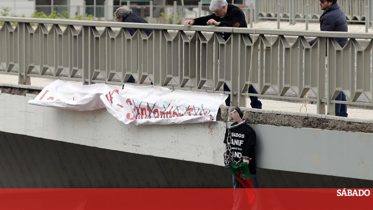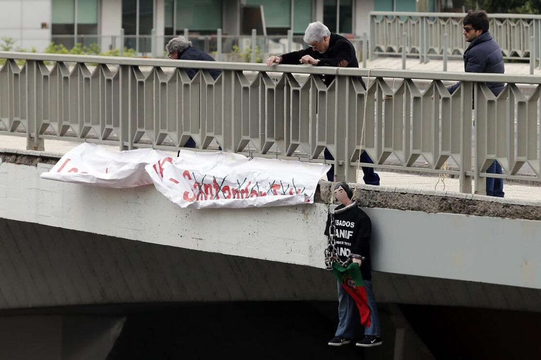 O protesto surpresa, que decorreu de forma pacífica e sem qualquer incidente, começou pelas 07h20, quando os elementos do grupo concentrados em frente ao edifício do Santander Totta, penduraram um manequim enforcado de tamanho real no viaduto sobre a Avenida Calouste Gulbenkian