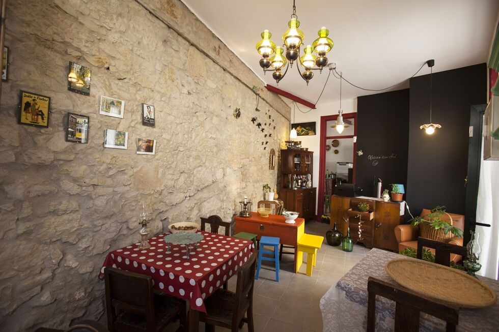 Janelas e portas verdes, cortinas e toalhas de renda, chocalhos, móveis antigos pintados, flores verdadeiras em vasinhos dispostos à porta para receber quem entra. Não há wi-fi para os clientes não se agarrarem ao telemóvel em vez de conviver.