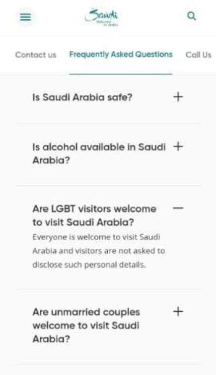 Agora, nas perguntas e respostas do site da Autoridade Saudita de Turismo, encontra-se a questão: "Os visitantes LGBT são bem-vindos na Arábia Saudita?", e a resposta é "todos são bem-vindos a visitar a Arábia Saudita e aos visitantes não é pedido que revelem pormenores tão pessoais".