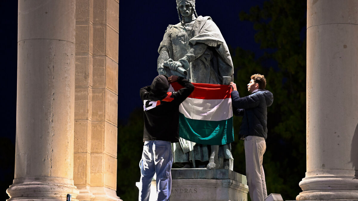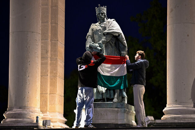 Manifestantes exibem bandeira da Hungria em frente à estátua de Rei André I, em BudapesteAP Photo/Denes Erdos