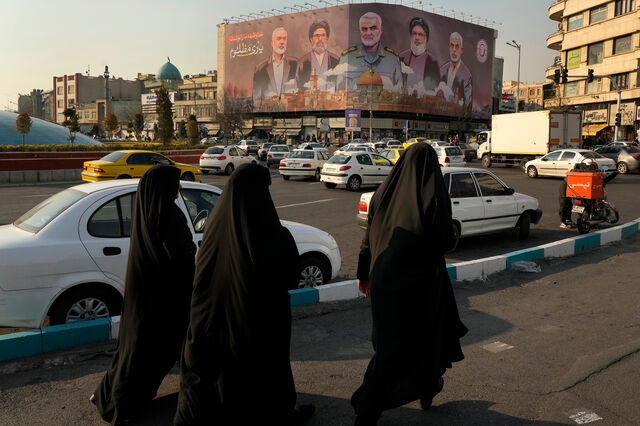 Teerão: Mulheres caminham junto a cartaz com figuras políticas AP Photo/Vahid Salemi, File