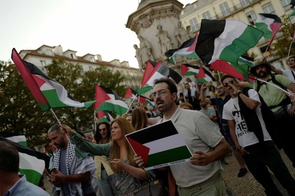 Entre as dezenas de manifestantes que se juntaram ao final da tarde no Largo Camões em Lisboa, vários trouxeram bandeiras palestinianas e cartazes em que podia ler-se "Abaixo o apartheid", ou palavras de ordem em inglês como "Resistência não é terrorismo" e "Libertem a Palestina imediatamente".
