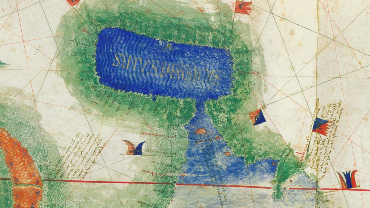 Pormenor do Planisfério de Cantino (1502), com o golfo Pérsico (a Azul) e o Estreito de Ormuz