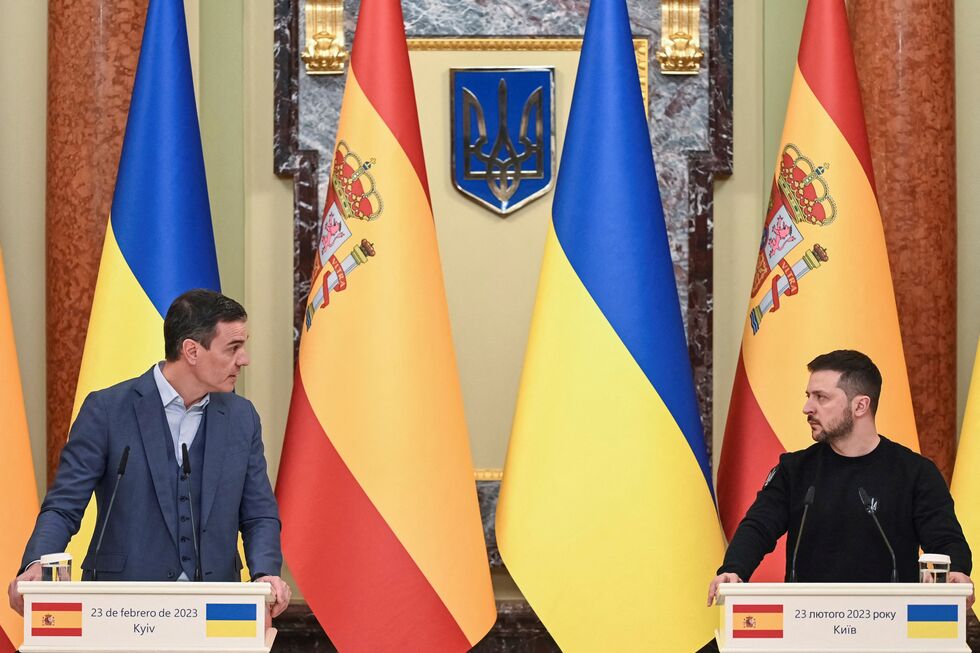 O presidente espanhol aterrou na capital ucraniana na véspera do primeiro aniversário da guerra e prometeu apoiar a Ucrânia "até que a paz volte à Europa".