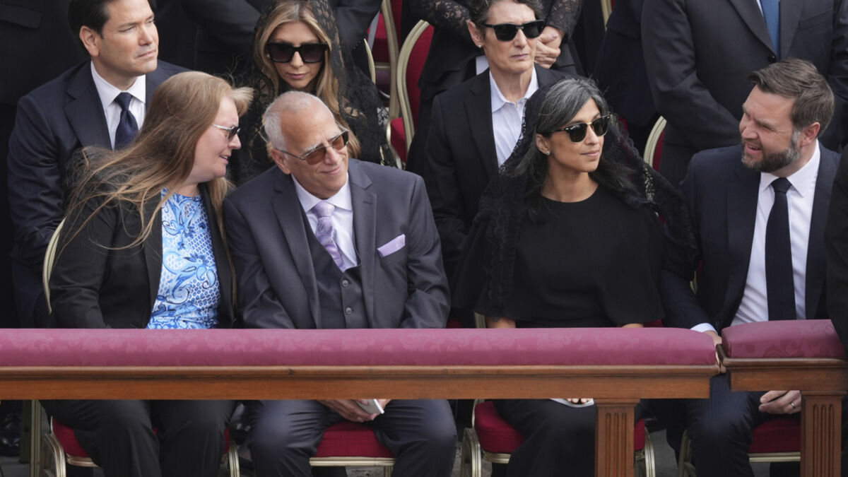 Louis Prevost, o irmão mais velho do Papa Leão XIV e a sua esposa Deborah, sentam-se ao lado do Vice-Presidente JD Vance durante uma missa para a inauguração oficial do pontificado do Papa Leão XIVAP