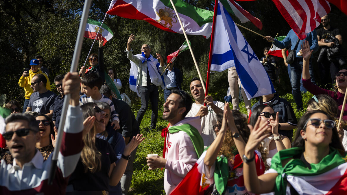 Os participantes exibiam bandeiras do Irão com o Leão e o Sol dourados, a bandeira anterior à atual da República Islâmica. E também se viam bandeiras dos EUA e Israel.