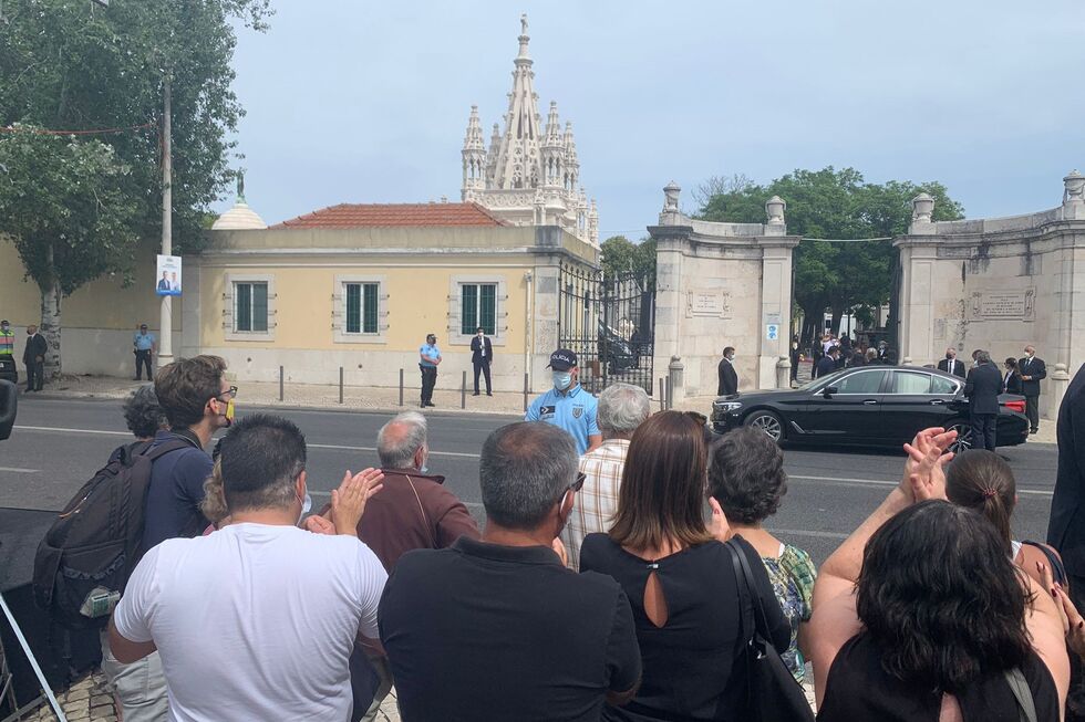 Junto ao cemitério, centenas de pessoas aplaudem o cortejo. Urna é seguida pela família e pelas três figuras do Estado.