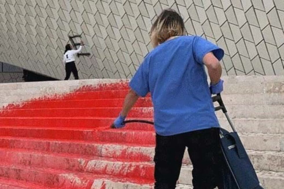 Segundo um comunicado do grupo ativista ambiental, duas pessoas terão sido detidas após escreverem na fachada e cobrirem de tinta vermelha a escadaria do MAAT.