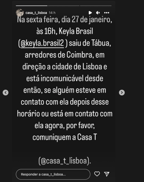 Keyla Brasil "está incomunicável" desde sexta-feira, dia 27, pelas 16h quando foi vista a entrar no autocarro, refere a publicação. "Se alguém esteve em contacto com ela depois desse horário ou está em contacto com ela agora, por favor, comuniquem à Casa T", apela a organização.