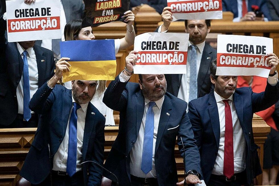 No dia 25 de Abril, os deputados do Chega bateram nas mesas e mostraram cartazes com as bandeiras da Ucrânia, e onde se podia ler "Chega de corrupção". O comportamento levou o presidente da Assembleia da República Santos Silva a exaltar-se: "Chega de porem vergonha no nome de Portugal", pediu. O presidente da Assembleia da República decidiu depois excluir o Chega das delegações das visitas a parlamentos estrangeiros.