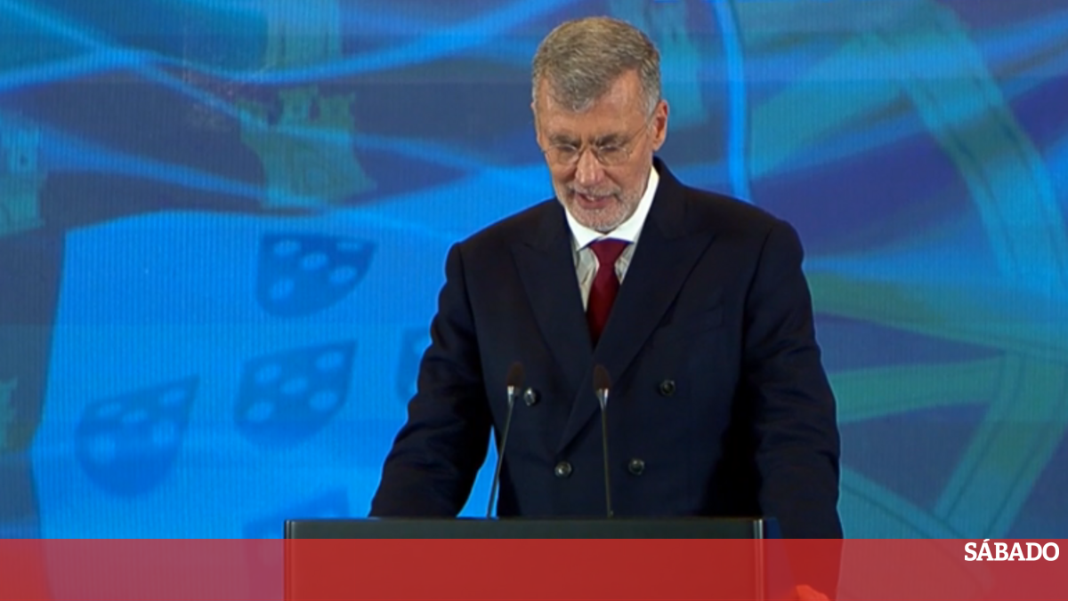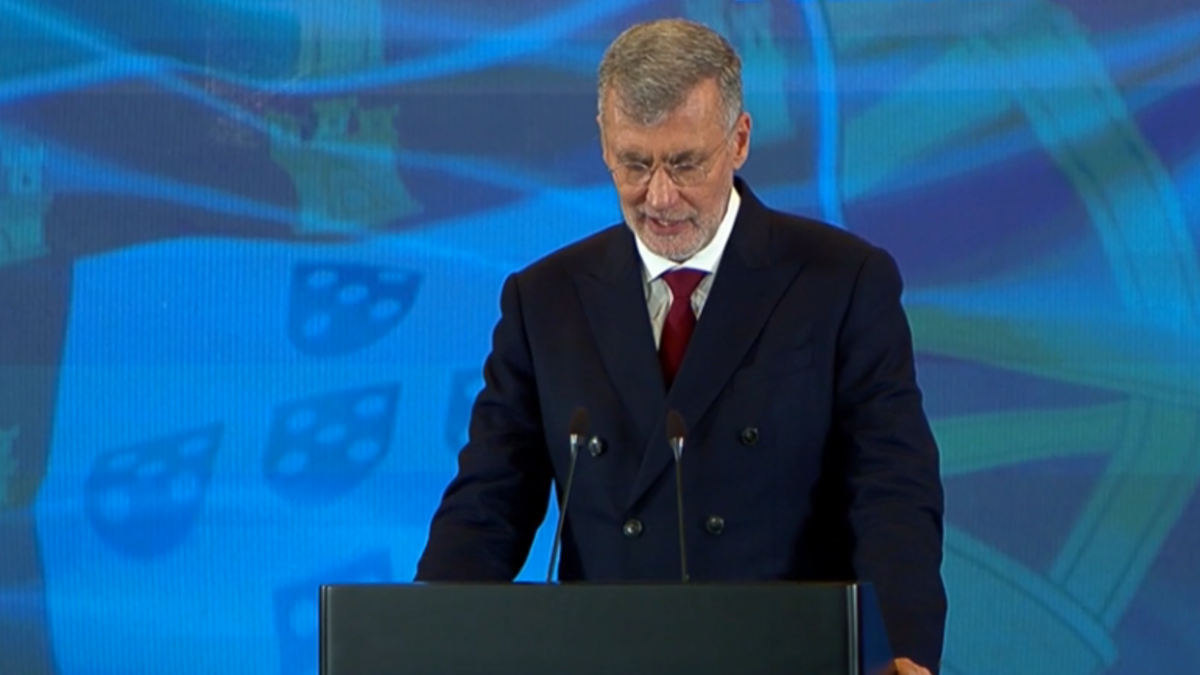 Gouveia e Melo discursa num evento com a bandeira de Portugal ao fundo