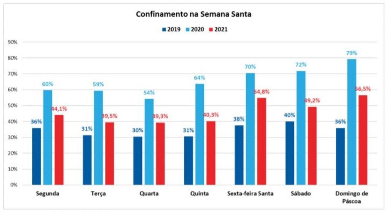 Em toda a Semana Santa, entre a Sexta-Feira Santa, dia 2 de abril, e o Domingo de Páscoa, a percentagem de portugueses em casa não foi menor que 49%, sendo que o dia com maior mobilidade foi o sábado - 16,7% deslocaram-se mais de 20 quilómetros e 10,2% deslocaram-se mais de 10 quilómetros.
