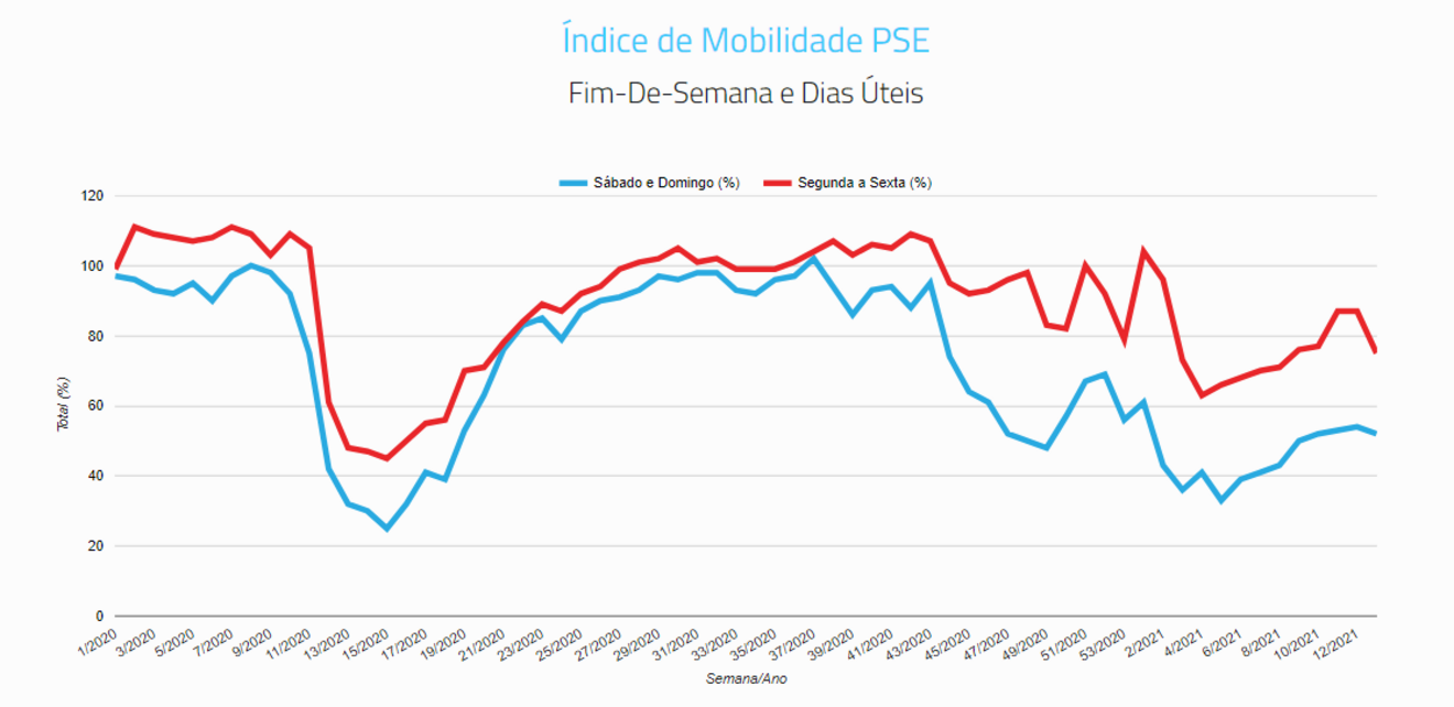 A PSE refere ainda que, em dias úteis na semana antes da Páscoa, o confinamento esteve próximo dos valores verificados antes da pandemia, em 2019. "Em média, o confinamento de 2021, nesta Semana Santa, foi apenas oito ou nove pontos percentuais acima dos valores normais, nos dias úteis."
