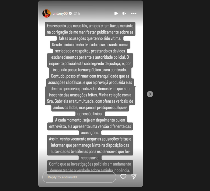 Já Antony garante que tudo não passa de "falsas acusações", diz estar "inocente" e a colaborar com as autoridades. Numa publicação no Instagram confirmou que a relação com a ex-namorada era "tumultuada, com ofensas verbais de ambos os lados" mas garante "jamais pratiquei qualquer agressão física".