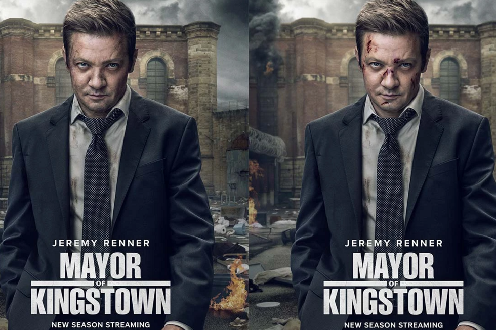 O cartaz publicitário da série Mayor of Kingstown,protagonizada por Jeremy Renner, foi editado devido ao acidente de que o ator foi vítima. Na imagem original, a cara do ator estava ferida e ensanguentada; na segunda versão, surgem algumas cicatrizes na sua cara.