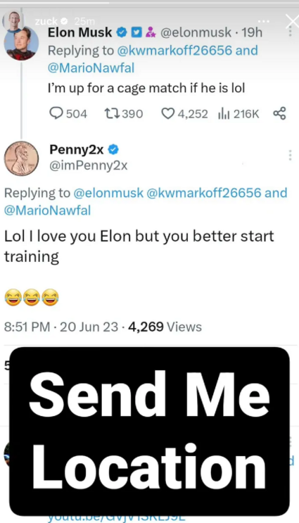 Tudo começou quando Elon Musk publicou uma mensagem no Twitter em como estava "pronto para uma luta de jaula" com Mark Zuckerberg, que se seguiu a um comentário de um utilizador sobre um projeto da Meta (empresa-mãe do Facebook e Instagram) para criar uma rede social concorrente do Twitter.